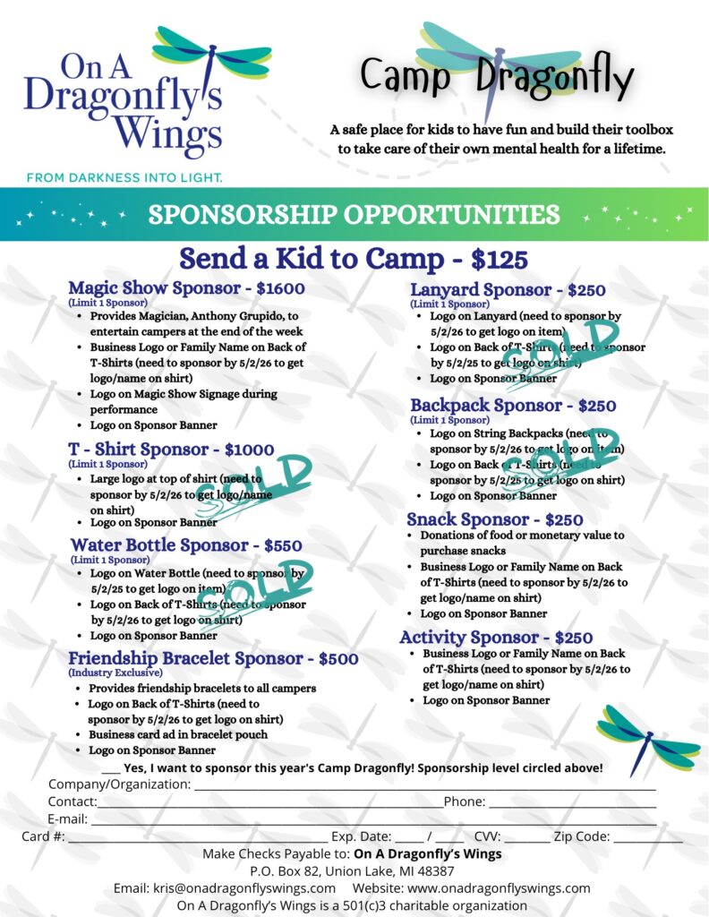 If you have any specific questions about Camp Dragonfly, please email kris@onadragonflyswings.com.