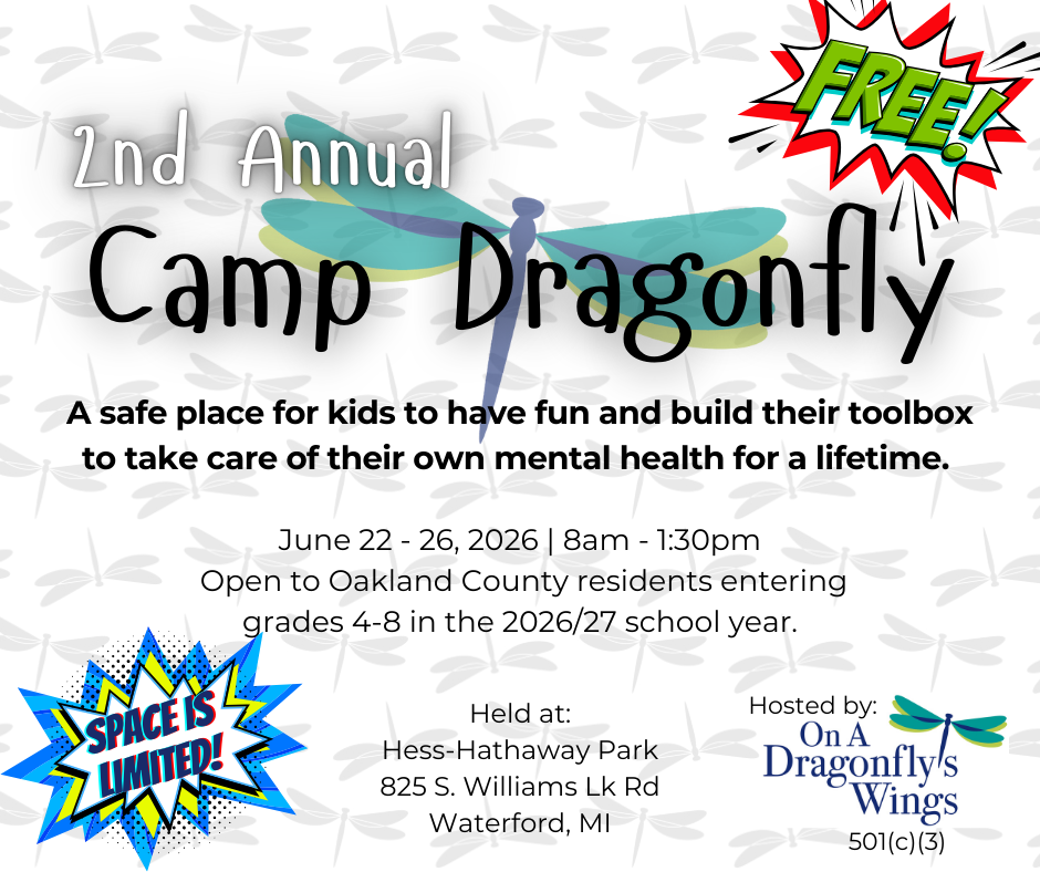 On A Dragonfly’s Wings is thrilled to be hosting our second annual youth mental wellness camp for kids who will be entering grades 4-8 in the 2026-27 school year. This camp is a free, week-long summer camp focusing on helping kids learn skills and strategies to develop strong mental health habits. The camp will be held at Hess Hathaway Farm in Waterford, Michigan, June 22-26, 2026 from 8am to 1:30pm.